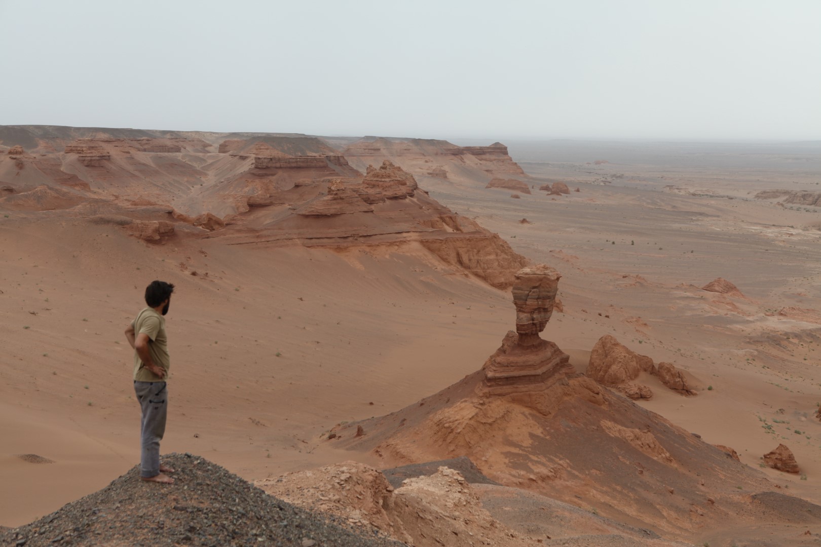 khongoryn els – erschöpfter reisender vor wüstenlandschaft